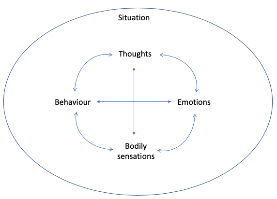 All these 5 areas link together and feed into each other like a vicious cycle, which maintains psychological distress. The ideas is, that if one of these areas can be targeted and changed, then it breaks the cycle and distress reduces, (e.g. challenging the negative automatic thoughts).