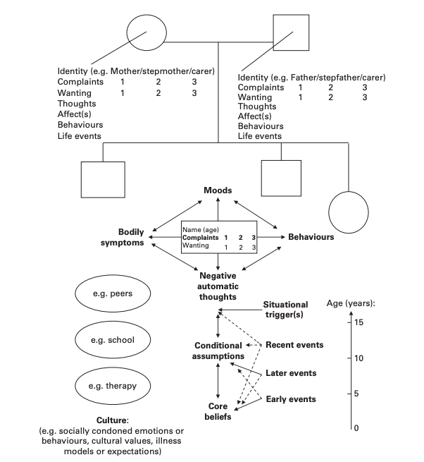 - At the top, we have the genogram, a core component of systemic formulations. This represents the key family relationships around the child, including some background on these family members, as well as their own views and hopes about the child’s current difficulties. Information about key family members is broken down into different topics, including: complaints, wanting, thoughts, affects, behaviours, life events.